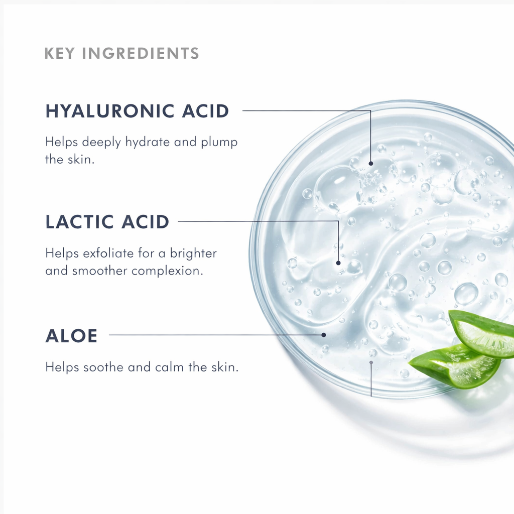 La formula con Acido Ialuronico, Acido Lattico e Aloe Vera aiuta a idratare, esfoliare delicatamente e lenire la pelle, migliorando la texture e l’aspetto dell’incarnato.