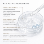 L’utilizzo di Acido ialuronico a basso, medio (400-1000 kDa) e alto peso molecolare (1800-2200 KDa) permette una migliore distribuzione della molecola, offrendo molteplici azioni. L’acido ialuronico ad alto peso molecolare ha azione fortemente idratante ed elasticizzante. Il medio peso molecolare ha azione filler dall’esterno, riempie la ruga e le imperfezioni con effetto rimpolpante, per un effetto lisciante immediato. Il basso peso molecolare ha azione filler ed effetto ristrutturante. In particolar modo, l’acido ialuronico a basso peso molecolare presente nella formulazione è altamente tecnologico e innovativo, in quanto è legato a una molecola di “protezione”, che ne permette una migliore performance e ne evita la degradazione che avverrebbe normalmente da parte degli enzimi presenti nella pelle.