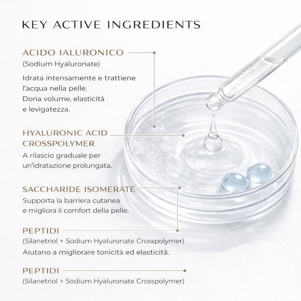 Acido ialuronico a basso peso molecolare e legato a silanoli (250 e 600 kda + silanetriolo) ha un effetto filler dall’esterno con elevata biodisponibilità. Questo acido Ialuronico si distingue dagli altri poiché non sfrutta le proprietà idratanti di un acido ialuronico, ma manifesta spiccate proprietà antiaging. La molecola di Silanetriolo, legata all’acido ialuronico a bassissimo peso molecolare, ne migliora la biodisponibilità e l’affinità allo strato corneo, favorendone la penetrazione. Incrementa il rinnovo della matrice epidermica contrastandone anche l’assottigliamento. Stimola la produzione endogena di glicosamminoglicani, effetto filler perché stimola anche la produzione di acido ialuronico “self”. Riparativo della funzione barriera, ridensificante, rimpolpante, effetto firming. Prepara e sostiene l’effetto dell’acido ialuronico micro-iniettato.